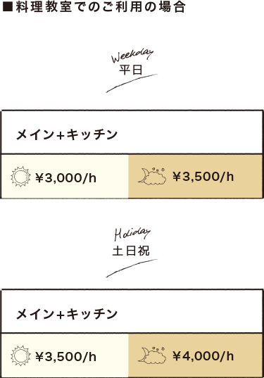 ◯キッチン利用の場合…IHコンロ・食器・グラス・オーブンレンジ等全て利用可 ※メインフロア利用時間と同じ時間とさせていただきます。